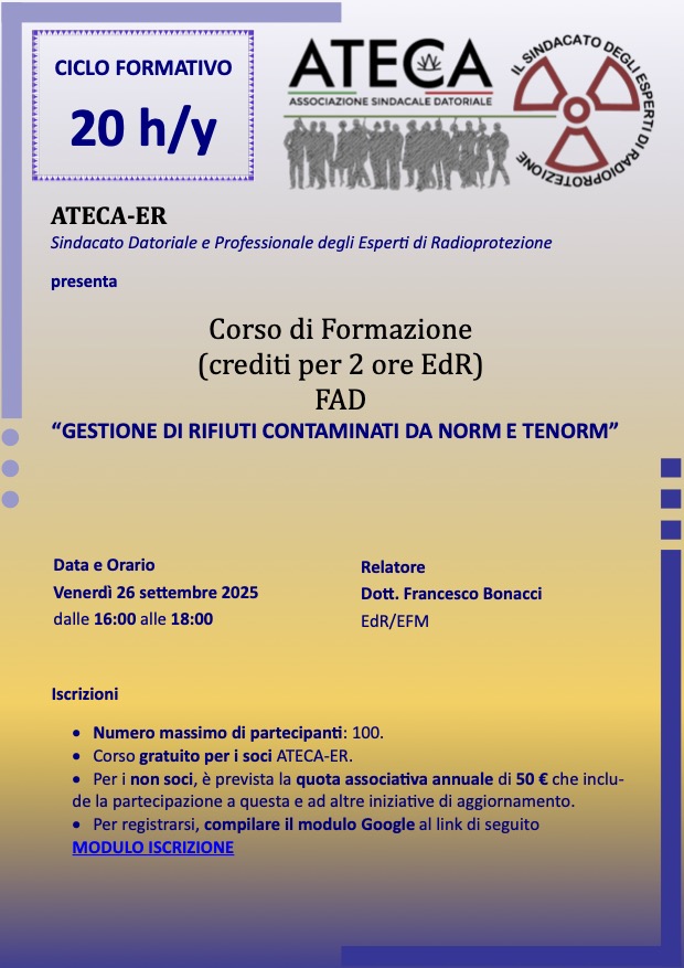 Il 26 Settembre 2025 dalle 16:00 alle 18:00 continua il ciclo di incontri formativi, organizzati da ATECA-ER, destinati agli Esperti di Radioprotezione.