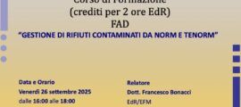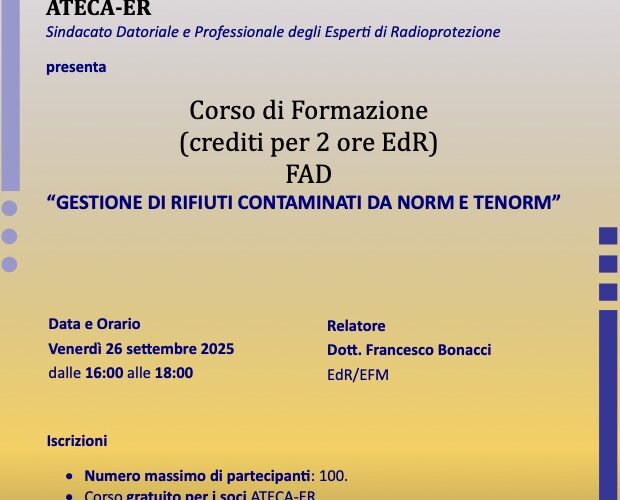 “GESTIONE DI RIFIUTI CONTAMINATI DA NORM E TENORM” Il 26 Settembre 2025 dalle 16:00 alle 18:00 continua il ciclo di incontri formativi, organizzati da ATECA-ER, destinati agli Esperti di Radioprotezione. Questo evento sarà di 2 ore e consentirà l‘erogazione del numero di ore corrispondenti come aggiornamento EdR, come descritto all’art. 129 del D. Lgs. 101/20. […]